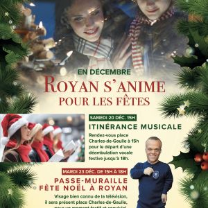 Samedi 20 déc. 15h Itinérance musicale Rendez-vous place Charles-de-Gaulle à 15h pour le départ d’une déambulation vocale festive dans les rues commerçantes, jusqu’à 18h. 3 formations aux univers complémentaires feront résonner l’esprit de Noël, entre tradition et modernité, un moment convivial pour petits et grands. Mardi 23 déc. Passe-Muraille fête Noël à Royan Passe-Muraille, visage […]